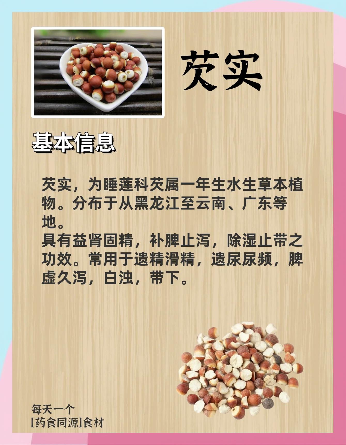 新鲜芡实的功效主要有以下几点固肾涩精强筋健骨从中医食疗的角度看,新鲜芡实入肾经,能够滋补肾精对于腰膝酸软腰腿痛以及带下遗精的人来说,适当食用芡实可以起到很好的固肾涩精强筋健骨的作用补脾止泻新鲜芡实对于脾胃虚弱食欲不振消化不良的人来说,有很好的滋补脾胃作用对于;芡实主要有以下功效健脾胃补中气适用于脾胃虚寒的人群对于湿气较重有白带问题的女性,以及有遗精滑精问题的男性,芡实都有良好的调理作用治疗白浊尿里总有白色沉淀气沫的症状,通常是由于脾虚湿气重导致的,芡实能有效缓解这一问题补肾固精芡实对男性的遗精滑精问题有较好的治疗;芡实具有补中益气的功效,被视为滋养强壮的食物尽管它与莲子在多方面相似,但芡实的收敛镇静作用更为显著因此,它适用于慢性泄泻小便频数梦遗滑精以及妇女带下腰酸等症状的调理对于遗精滑精虚弱小儿遗尿以及老年人小便频数的问题,有一种方法是将芡实与金樱子菟丝子车前子等药材搭配使用;1 补脾止泻芡实莲子山药都具有补脾止泻的功效,对于脾胃虚弱引起的腹泻消化不良等症状有很好的治疗效果2 固肾益精芡实与莲子都具有固肾益精的作用,对于肾虚引起的腰膝酸软头晕耳鸣等症状有显著的改善作用3 利水渗湿茯苓具有利水渗湿的功效,与芡实一起使用,可以加强祛湿作用;芡实的功效主要包括以下几点健脾益肾芡实的性能与莲子相似,是健脾益肾的佳品,自古被视为永葆青春活力防止未老先衰的良物补中益气芡实是一种滋养强壮性食物,具有补中益气的功效固肾涩精芡实具有较强的收敛镇静作用,适用于遗精滑精梦遗等症状补脾止泄对于慢性泄泻,包括慢性肠结核。