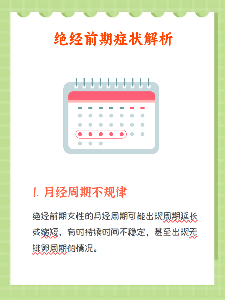 在女性进入绝经前期,身体会逐渐展现出一些明显的症状,这些信号能够帮助我们及时了解身体的变化对于那些渴望掌握自身身体状况变化的朋友来说,了解这些绝经前的症状显得尤为重要第一月经间隔延长 部分女性的月经周期由原先的每月一次逐渐演变为每两个月或三个月一次,甚至时间间隔更长在月经量方面,有。