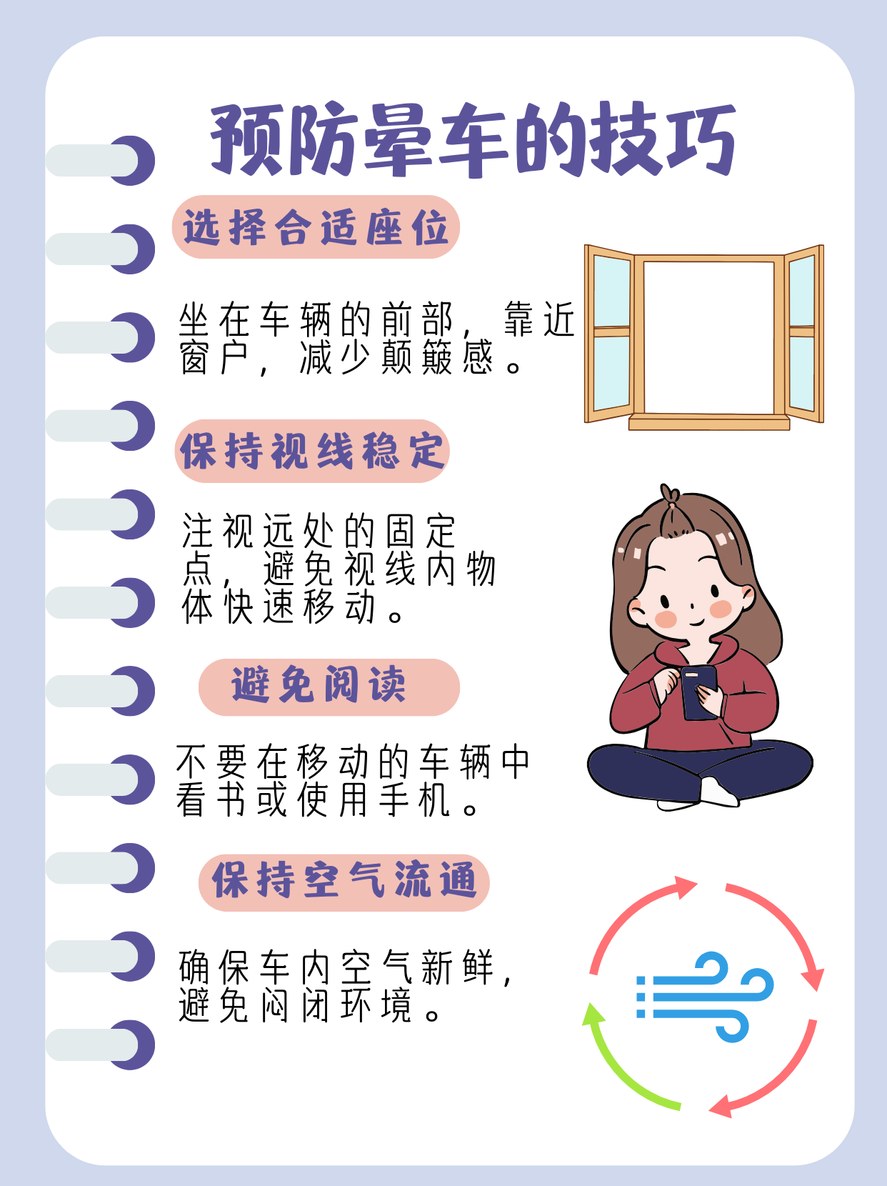 5、晕车时可以采取以下措施来缓解症状静卧休息发生晕车时,应尽量保持静止不动,避免说话如果有条件,可以躺下休息,这能有效减轻晕车带来的不适感避免走动在车厢内随意走动会加剧晕车症状,因此应尽量避免不要进食或饮水晕车时吃东西或饮水可能会引发恶心呕吐如果确实口渴,可以少量饮水准备。
