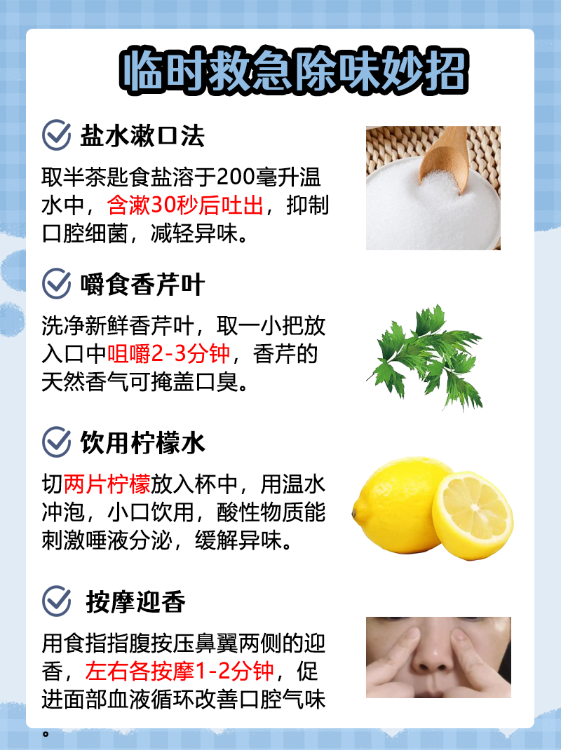 9、根本解决还需针对原因进行治疗处理口臭的建议保持口腔清洁养成饭后漱口的习惯,注意去除牙齿间的食物残渣饮食清淡辛辣油炸等食物易刺激口臭,应尽量避免多喝茶茶能抑制口腔细菌生长,稀释口臭减少或戒掉不良习惯如吸烟和过度咀嚼槟榔积极治疗原发病如牙周炎和呼吸系统疾病等。