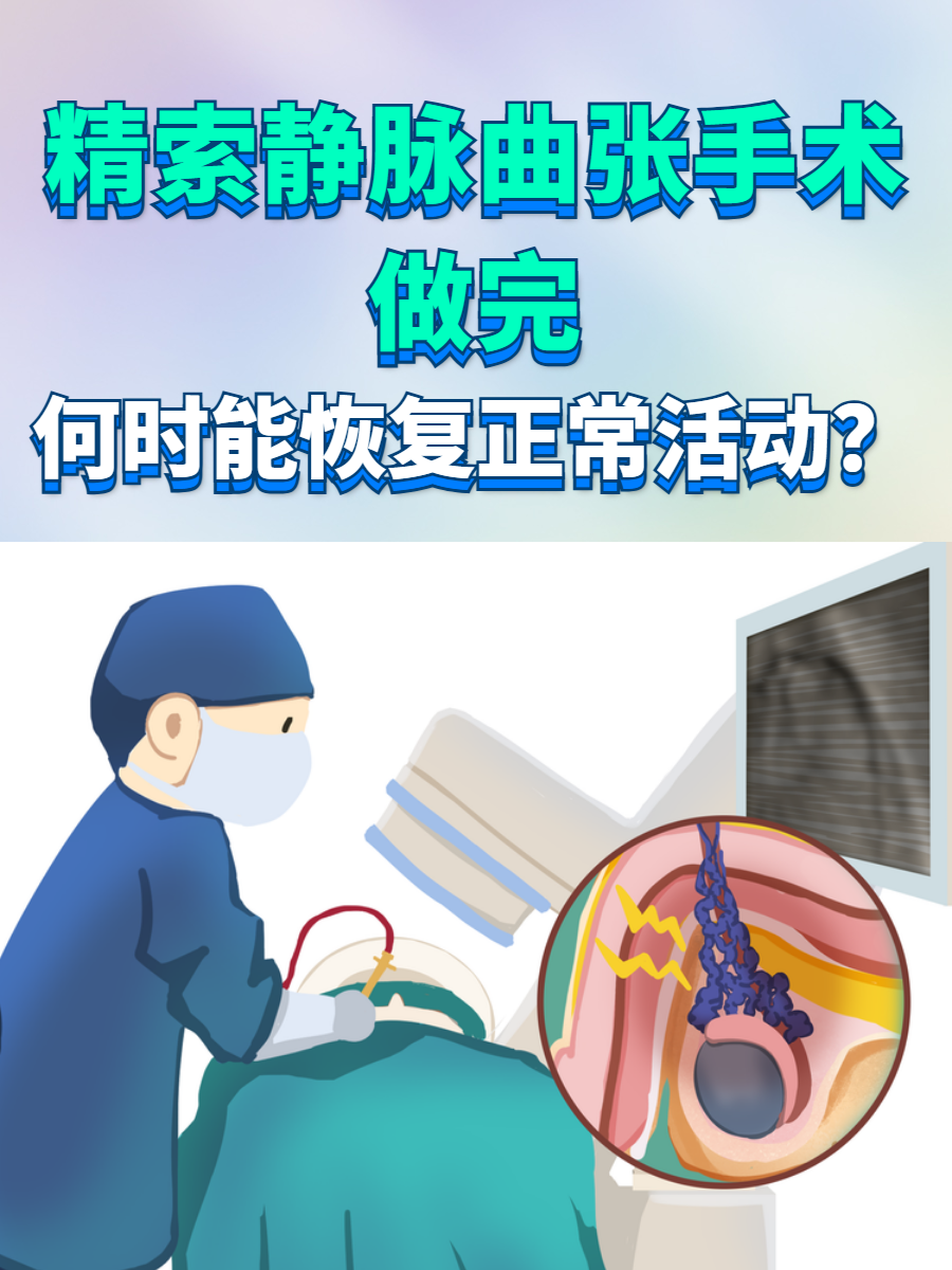 精索静脉曲张的恢复时间主要取决于手术后的恢复情况以及新精索静脉的生长情况,具体如下1 肌肉力量恢复 手术后,由于涉及到肌肉力量的配合,活动时可能会有疼痛感这主要是因为手术过程中对3层肌肉造成了损伤 肌肉力量恢复时间一般来说,肌肉力量在24个星期内可以完全恢复2 新精索静脉生长;腹腔镜下精索静脉曲张手术肠道恢复一般需要12天出院时间术后35天可出院恢复正常工作大约半个月左右可以上班显微镜下精索静脉曲张手术打麻醉情况若采用打麻醉方式,恢复通常需要23天出院及恢复时间出院后,恢复时间大约35天若采用局麻方式,手术时间1小时以内,术后即可出院,休息12天;精索静脉曲张手术后恢复时间因手术方式而异,具体如下一传统外科手术 创面恢复时间通常会超过3周二微创介入治疗 即刻下床行走一般术后可以即刻下床行走 局部水肿反应术后1周左右,局部可能会因泡沫硬化剂栓塞材料引起水肿反应,产生局部胀痛等,影响患者的生活和工作 肿胀消退术后2周;术后半年患者的身体已经基本恢复,侧支循环也已建立稳定,此时可以进行正常的锻炼活动同时,精子质量和数量也应得到改善,特别是对于因精索静脉引起的睾丸生精功能下降的患者,术后三个月至半年内精子数量和质量会有显著提升注意术后恢复时间可能因个体差异而有所不同,患者应遵循医生的建议,根据;传统精索静脉曲张手术由于需要在下腹部开35cm长的刀口,手术之后一般要在7天左右进行拆线,所以恢复到正常通常需要一周的时间腹腔镜手术属于微创手术,损伤很小,恢复通常较快,大部分病人在手术后的第二天就可以下床活动,甚至是出院回家,所以手术的恢复时间通常是23天显微镜的精索静脉结扎手术开口的部位更靠近阴囊,刀口大概是12cm,术后恢复也很快,第二天就可以。