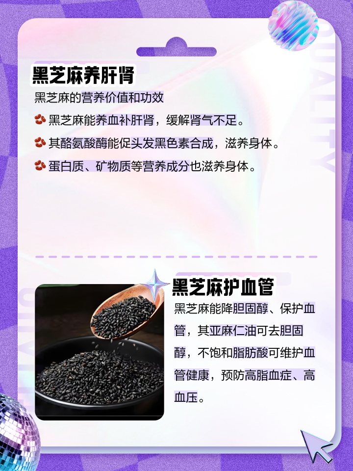 含有大量天然无害的植物性蛋白和不饱和脂肪酸高营养利用率不仅不产生大量油脂,还能高效补充身体所需的重要营养物质健脑益智延年益寿黑芝麻中的不饱和脂肪酸被认为具有延年益寿的功效预防胆结石常吃黑芝麻有助于预防和治疗胆结石提升智力黑芝麻还有健脑益智的作用,对大脑健康有益。