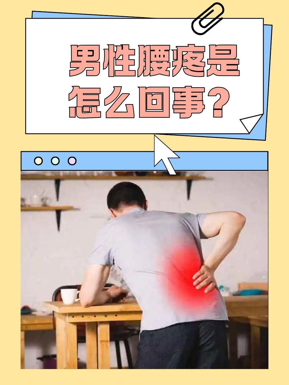 3、男人总是腰疼可能与以下原因有关腰部异常对于腰椎间盘突出的人群,腰部疼痛是常见的症状这类人群需要积极治疗腰部问题,并在日常生活中注意对腰部的保养调整坐姿,保持腰背挺直,避免腰部弯曲拉动脊椎,从而维护腰部健康肾虚腰疼还可能是肾虚导致的如果男性日常生活不规律,或者过分消耗精力,就可。