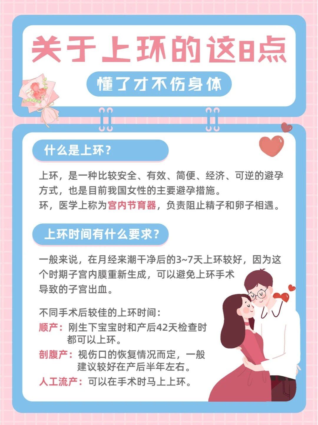 5、上环的最佳时间根据具体情况有所不同剖腹产后如果女性在剖腹产手术后想要通过上环来避孕,最佳时间是在剖腹产后半年,但必须确保没有怀孕人工流产后对于行人工流产终止妊娠的女性,如果不再有生育要求,上环的最佳时间通常是在人工流产后立即放置,可以与人流手术一起进行同房后如果在同房的时候;如今,许多女性选择使用避孕环作为避孕方式,尽管上环手术操作简便且避孕效果显著,但该方法仍可能对女性身体造成一定伤害为了最大限度地减少这种伤害并提升避孕效果,选择恰当的上环时机至关重要首先,月经结束后的7天内是理想的上环时间此时,子宫内膜处于生长阶段,上环导致的轻微损伤能够迅速恢复此外。