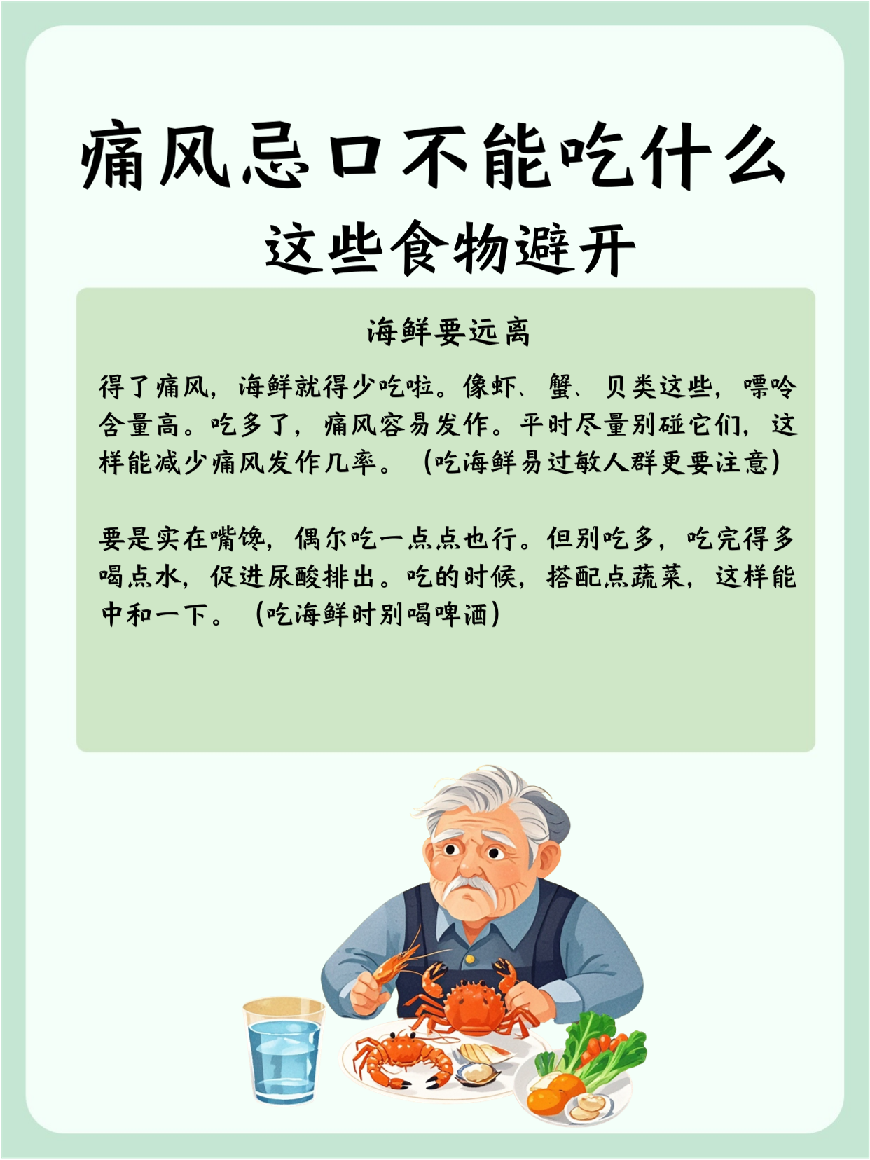 1、控制饮食只是治疗的一部分,而想要尽快摆脱这种想吃却不能吃的窘境的话,就要赶快接受治疗,按时按量用药,力求缓解甚至治愈痛风疾病痛风吃什么好 1多吃蔬菜,多吃高钾质食物,如香蕉西兰花西芹钾质可减少尿酸沉淀,有助将尿酸排出体外2多吃碳水化合物有益于尿酸的排出,痛风病人可食用富含;痛风患者需避免以下食物,以控制病情发展1高嘌呤食物痛风的核心病因是嘌呤代谢紊乱导致血尿酸水平升高动物内脏如肝肾海鲜如沙丁鱼贝类肉汤及浓肉汁等高嘌呤食物会直接增加尿酸生成,需严格限制摄入2酒类酒精代谢产生的乳酸会抑制尿酸排泄,导致血尿酸浓度升高啤酒白酒红酒等所有。