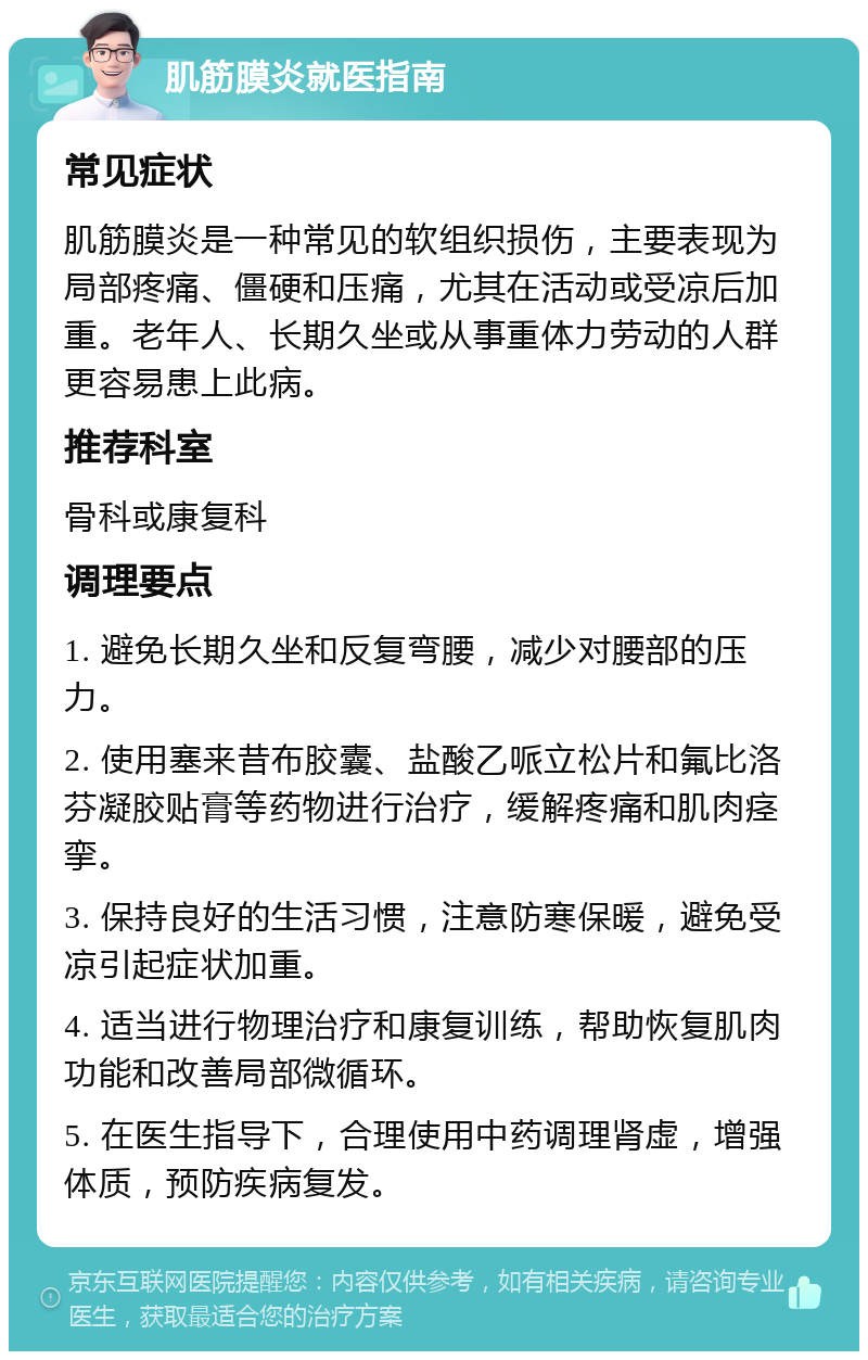 9、疼痛这是腰背肌筋膜炎最主要的症状,表现为腰背部局部的疼痛疼痛通常较为局限,且在着凉劳累或长期从事某一工作后可能加重活动受限由于疼痛的影响,患者的腰部活动可能受到限制,如弯腰转身等动作可能变得困难查体特征在进行查体时,医生可能会发现患者腰背部有明确的叩压痛影像学检查通常。