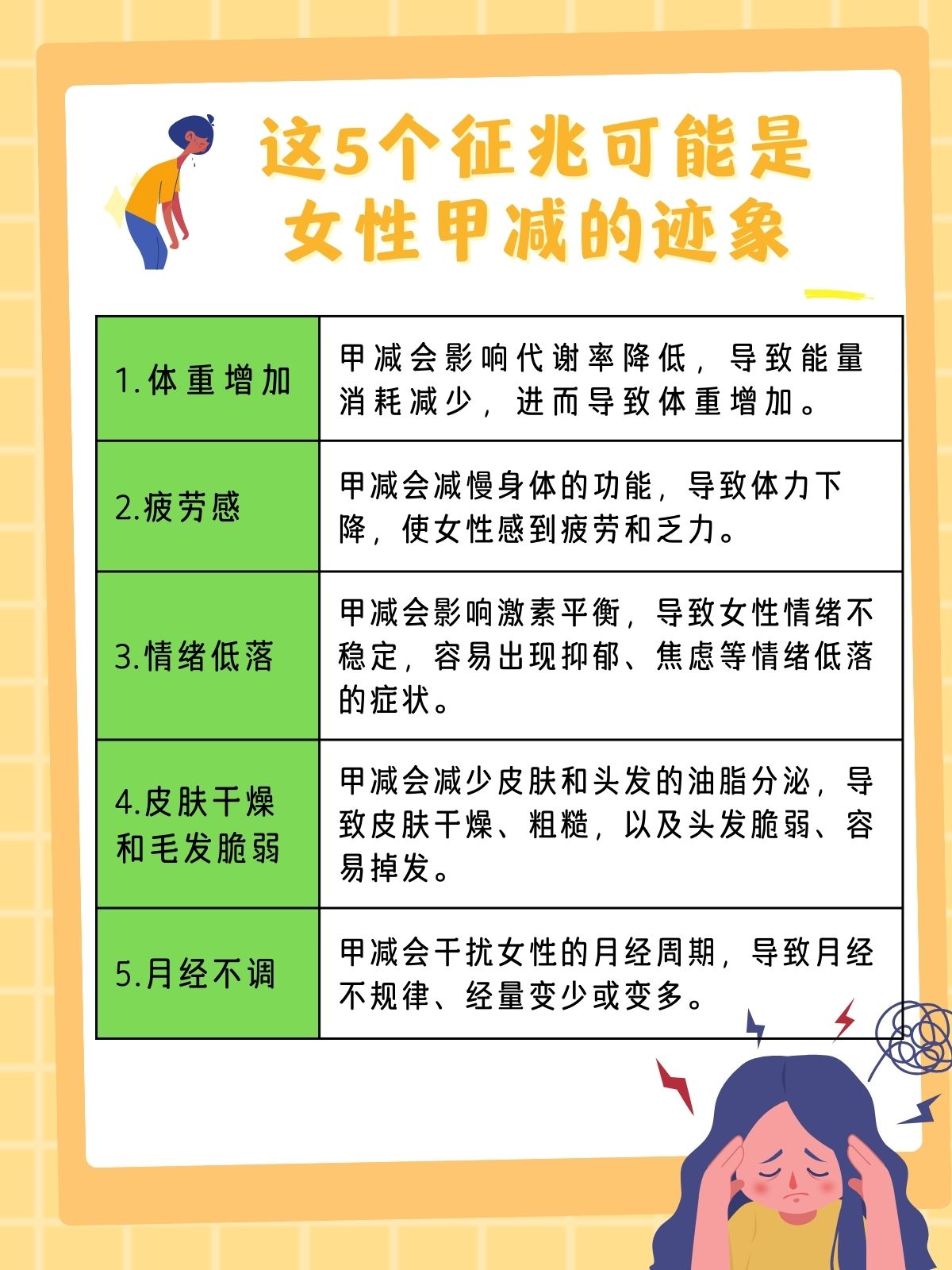 女性患甲减的症状主要包括以下几点食欲不振与消化不良 甲状腺激素分泌不足会导致肠道蠕动变慢,从而使患者出现食欲不振和消化不良的情况患者可能伴有胀气,进一步影响食欲,形成恶性循环长期下来,可能导致便秘身体怕冷以及疲劳不堪月经不调与不孕流产 甲减对女性的生殖系统有显著影响,可能导致月经不。