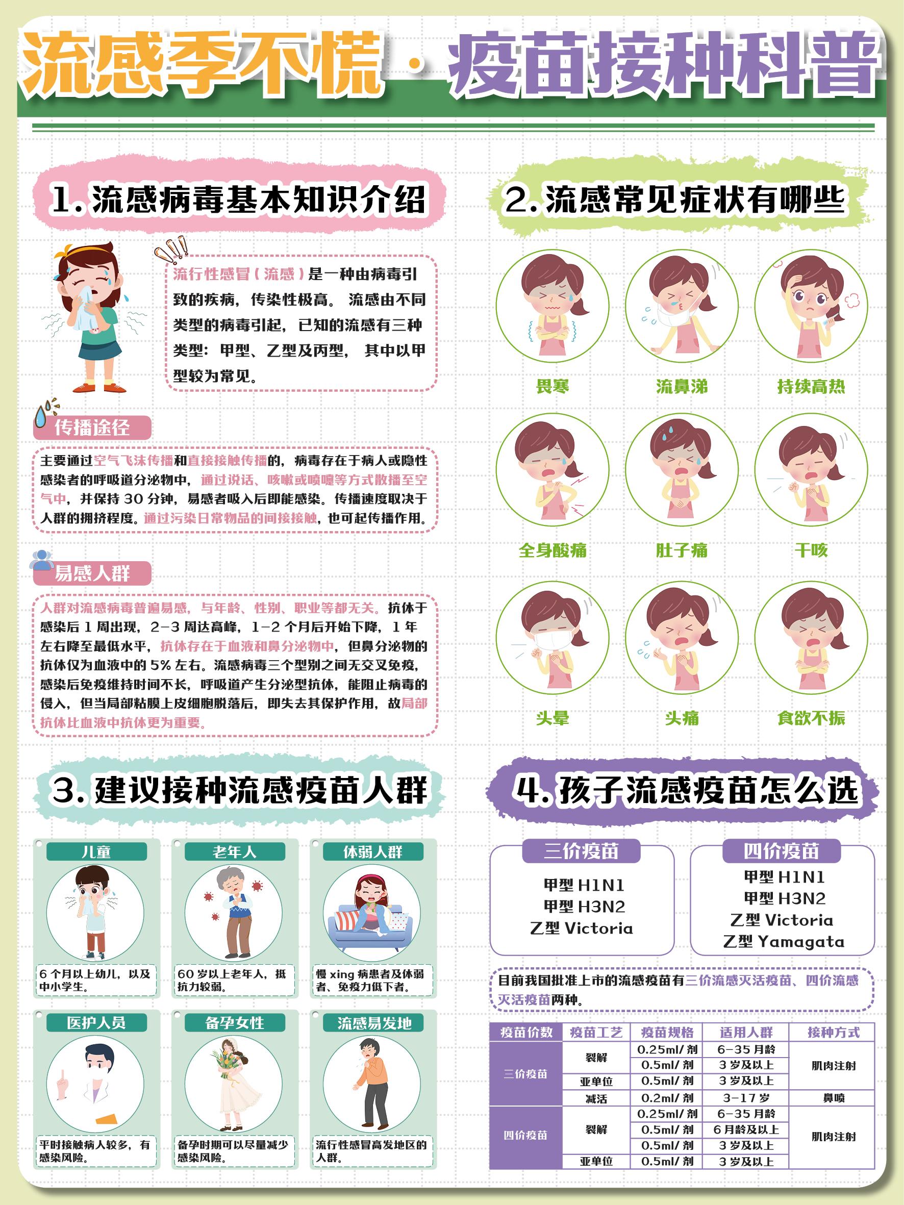 流感疫苗大概能预防1年左右的时间,且流感疫苗是每年都需要打的以下是详细解释一流感疫苗免疫力的维持时间 流感疫苗注射后,抗体滴度在前几个月较高,随着时间推移逐渐下降流感疫苗大概能预防1年左右的时间,即接种一次流感疫苗可以提供大约一年的保护二为什么流感疫苗需要每年接种 流感病毒每年;流感疫苗打一次只有一年的保护效力,一般情况下只有10个月,所以为达到有效的保护作用,需要年年打重点是需要免疫力低下的人群,以及儿童老年人,年年进行保护性注射流感疫苗主要是预防流行性感冒,流感主要是流感病毒引起的急性呼吸道传播疾病,主要的临床表现有鼻塞流涕咽喉肿痛咳嗽咳痰,部分;第二年及以后每年接种一针即可36个月以上及成人每年接种一针流感疫苗注意事项 流感疫苗属于二类疫苗,自愿接种且自费 打疫苗期间应避免感冒,如有呼吸道感染,需控制症状一周后才可接种疫苗 接种后应注意保暖,避免碰凉水或洗澡,饮食上避免辛辣刺激性强的食品,戒烟戒酒;不过,由于流感菌株每年都会有变化,而在注射流感疫苗后,随着时间的推移抗体在体内也会出现下降的情况,所以流感疫苗须每年都注射才能保持持续的免疫效果打流感疫苗应避免空腹接种,所以家长带宝宝去打流感疫苗,应提前半小时将宝宝喂饱另外这种完成后需要在接种处逗留30分钟左右,观察孩子注射后是否会出现;流感疫苗一般情况下需要年年打以下是具体原因保护效力有限流感疫苗的保护效力通常只有一年,有时甚至只有10个月这意味着疫苗提供的免疫保护会随着时间的推移而逐渐减弱病毒变异流感病毒具有高度变异性,每年流行的病毒株可能会有所不同因此,为了针对当年流行的病毒株提供有效的保护,需要年年。