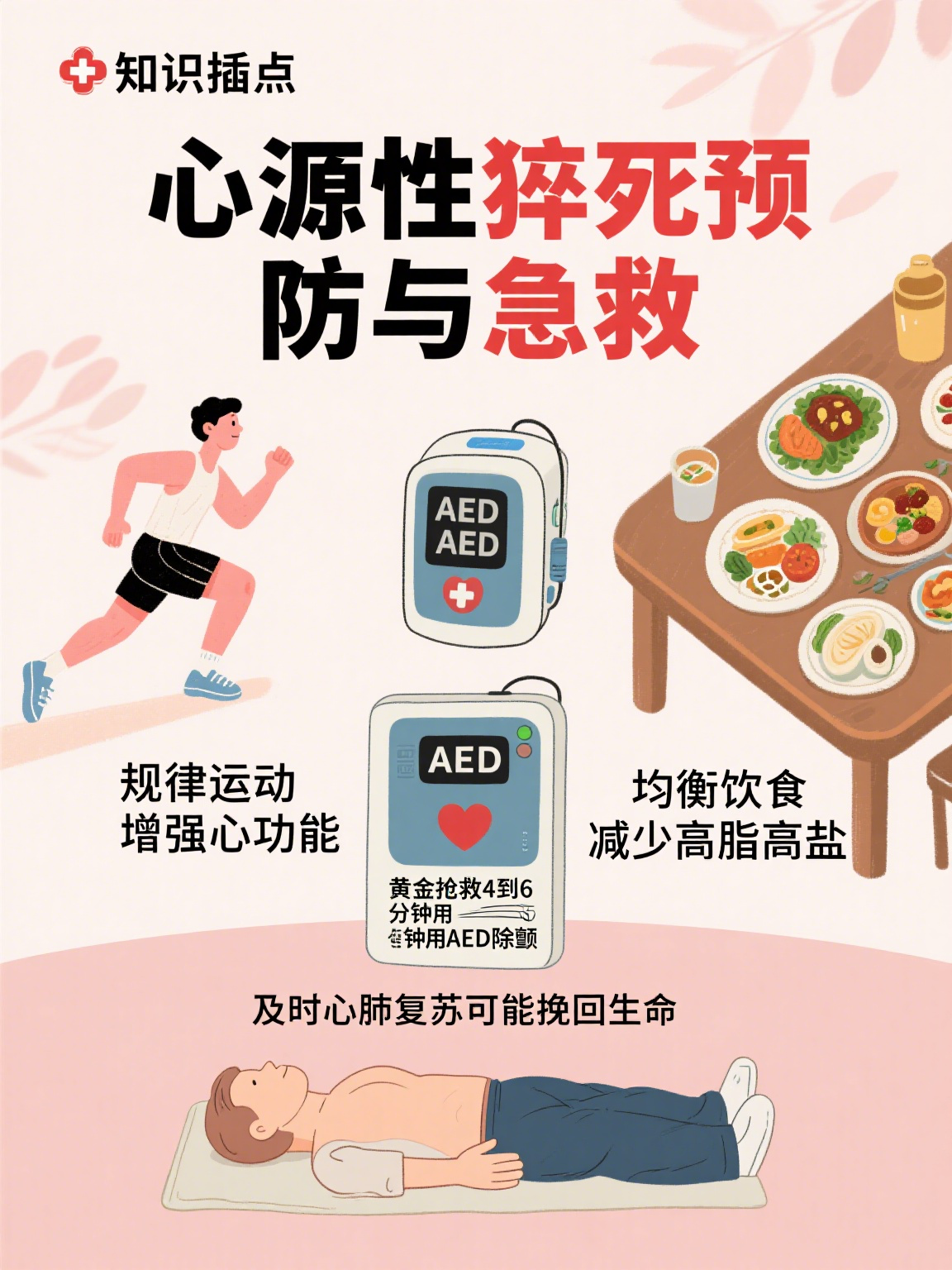 回答心源性猝死是在发病后6小时内突然死亡,多由于心电不稳定所致,症状突然出现,往往立即死亡预防心源性猝死,应注意一增强定期查体及治病意识,及时发现及治疗各种心脏病二养成良好生活习惯,不吸烟不酗酒劳逸结合健康饮食,进行规律的有氧运动三多吃水果和纤维素含量高的食物,保持大便。