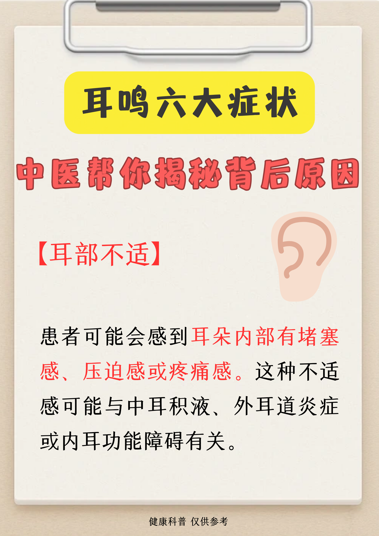 耳鸣和脑鸣的主要区别在于发病部位和听觉感受发病部位耳鸣通常发生在耳内,是耳内鸣响的现象脑鸣主要发生在脑内,也被称作头鸣,发病部位与耳鸣不同,但实际上脑鸣基本上可以视为耳鸣的一种特殊类型听觉感受耳鸣根据耳聋类型的不同,耳鸣的声音也有所差异传导性耳聋的耳鸣通常表现为。