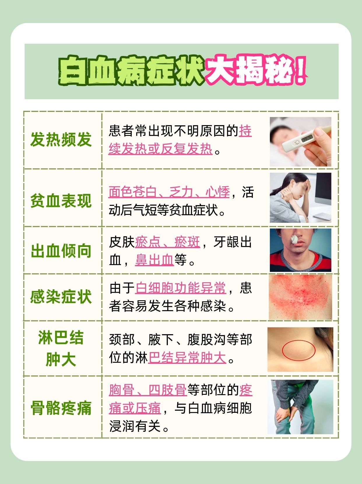 白血病主要分为急性与慢性两种类型,其中急性白血病的自然病程通常为半年到一年然而,经过适当的治疗,许多患者可以存活10年以上,甚至20多年在某些情况下,骨髓移植的成功率较高,能够实现长期生存值得注意的是,白血病的症状多样,其中严重贫血是常见表现之一,但这并不一定是白血病的唯一或主要症状。