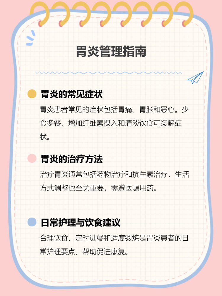 慢性肠胃炎的治疗方法主要包括生活习惯的调整和药物治疗两方面生活习惯的调整 避免腹部受凉患者应注意腹部保暖,避免寒冷刺激导致肠胃炎症状加重 保持情绪稳定情绪的稳定对肠胃炎的恢复有积极影响,患者应尽量放松心情,避免过度紧张和焦虑 调整饮食避免食用油炸辛辣刺激的食物,选择清淡易消化。