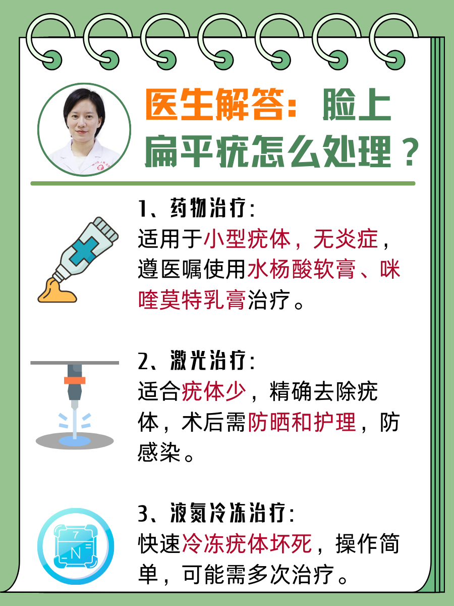 扁平疣目前尚无绝对“根治”的单一方法,但通过科学治疗和综合管理可实现临床治愈并降低复发风险具体措施如下一根据病情选择治疗方案1外用药物适用于疣体较少症状较轻的患者常用药物包括维A酸乳膏调节角质形成细胞分化咪喹莫特乳膏诱导免疫应答氟尿嘧啶软膏抑制病毒DNA合成。
