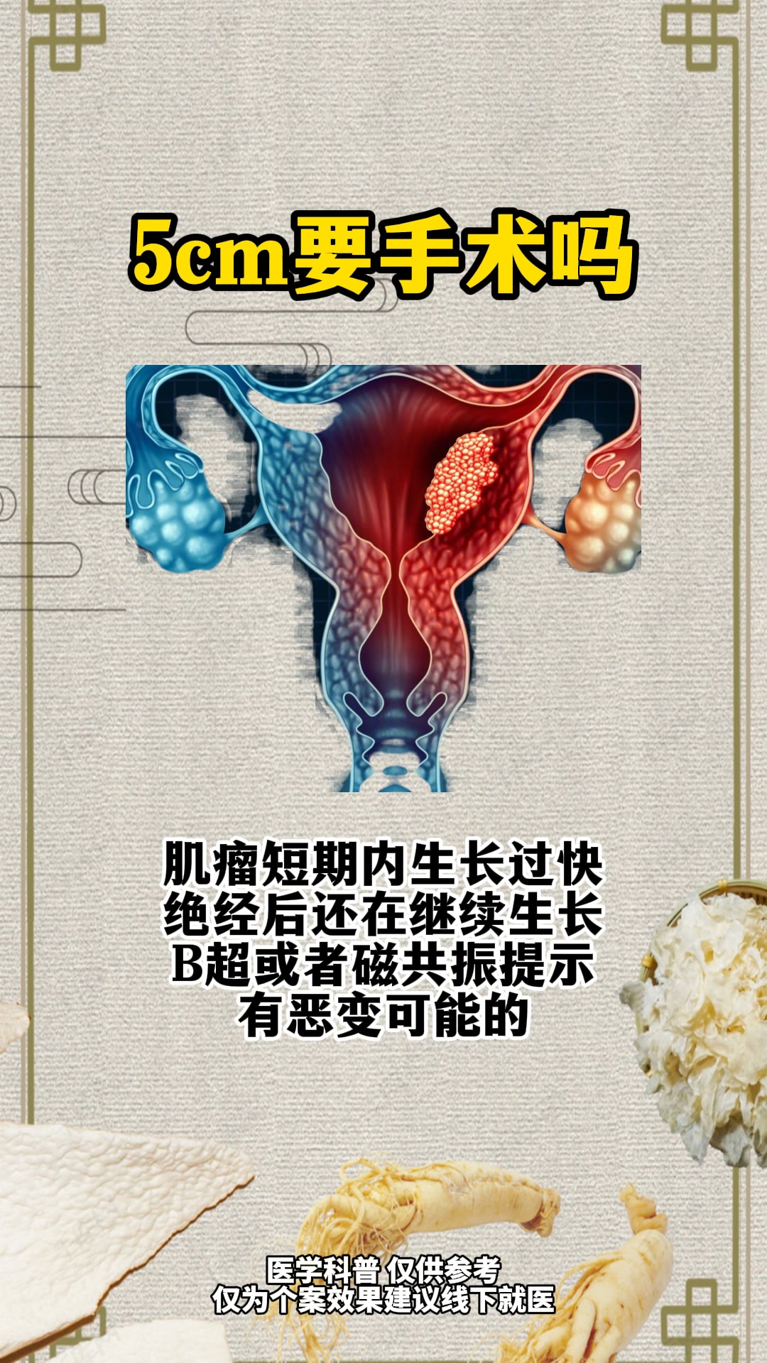 4 无症状患者的观察策略若患者无任何不适,且无生育需求,可采取定期复查每612个月的方式,通过超声监测肌瘤大小形态及血流变化此类患者无需立即手术,但需警惕新发症状的出现5 个性化治疗方案的选择手术并非唯一选择,医生会结合患者年龄肌瘤位置黏膜下肌壁间浆膜下全身状况等;压迫症状肌瘤增大压迫到膀胱导致尿潴留,或压迫到直肠导致排便困难,也是手术的指征不孕或流产若肌瘤是导致不孕或反复流产的唯一因素,如肌瘤向子宫内膜内生长,也需考虑手术其他因素绝经情况对于已绝经的女性,若子宫肌瘤逐渐变小,则可能无需手术但若肌瘤持续增大,仍需考虑手术恶性变可能;子宫肌瘤在以下情况下需要考虑手术治疗单发的子宫肌瘤超过5cm当单个子宫肌瘤的直径超过5厘米时,通常被视为手术的一个指征多发的子宫肌瘤导致子宫增大如孕3个月大小如果子宫内存在多个肌瘤,导致整个子宫增大到相当于怀孕3个月的大小,且药物治疗效果不理想,也建议进行手术治疗子宫肌瘤未达5cm但;子宫肌瘤是否需要手术,不仅取决于其大小,还取决于其引起的症状和其他因素单个子宫肌瘤超过5cm在一些年龄较大的患者中,如果单个子宫肌瘤的直径超过5cm,通常需要考虑手术治疗多发性子宫肌瘤且子宫增大即使单个子宫肌瘤没有超过5cm,但如果肌瘤数量多,导致子宫显著增大,也符合手术指征引起明显症状;超过限制的情况如果子宫肌瘤超过5cm,并且数量超过2个以上,那么腹腔镜下的子宫肌瘤切除术会比较困难这主要是因为切除较大的肌瘤后止血较为困难,且手术后如果还需要妊娠,子宫肌瘤的瘤腔缝合也会比较困难,这可能对下一次生育产生影响,增加子宫破裂的风险因此,在考虑进行微创手术时,需要综合考虑子宫;子宫肌瘤是否需要手术,并不单纯取决于其大小,而更多地取决于是否引起症状以及对生育的影响具体来说无症状且肌瘤较小在没有症状的情况下,即使子宫肌瘤超过5公分,也可以考虑观察,不必急于手术这是因为子宫肌瘤是激素依赖性的,随着年龄增大,到绝经后可能会自然萎缩引起症状或影响生育如果子宫。