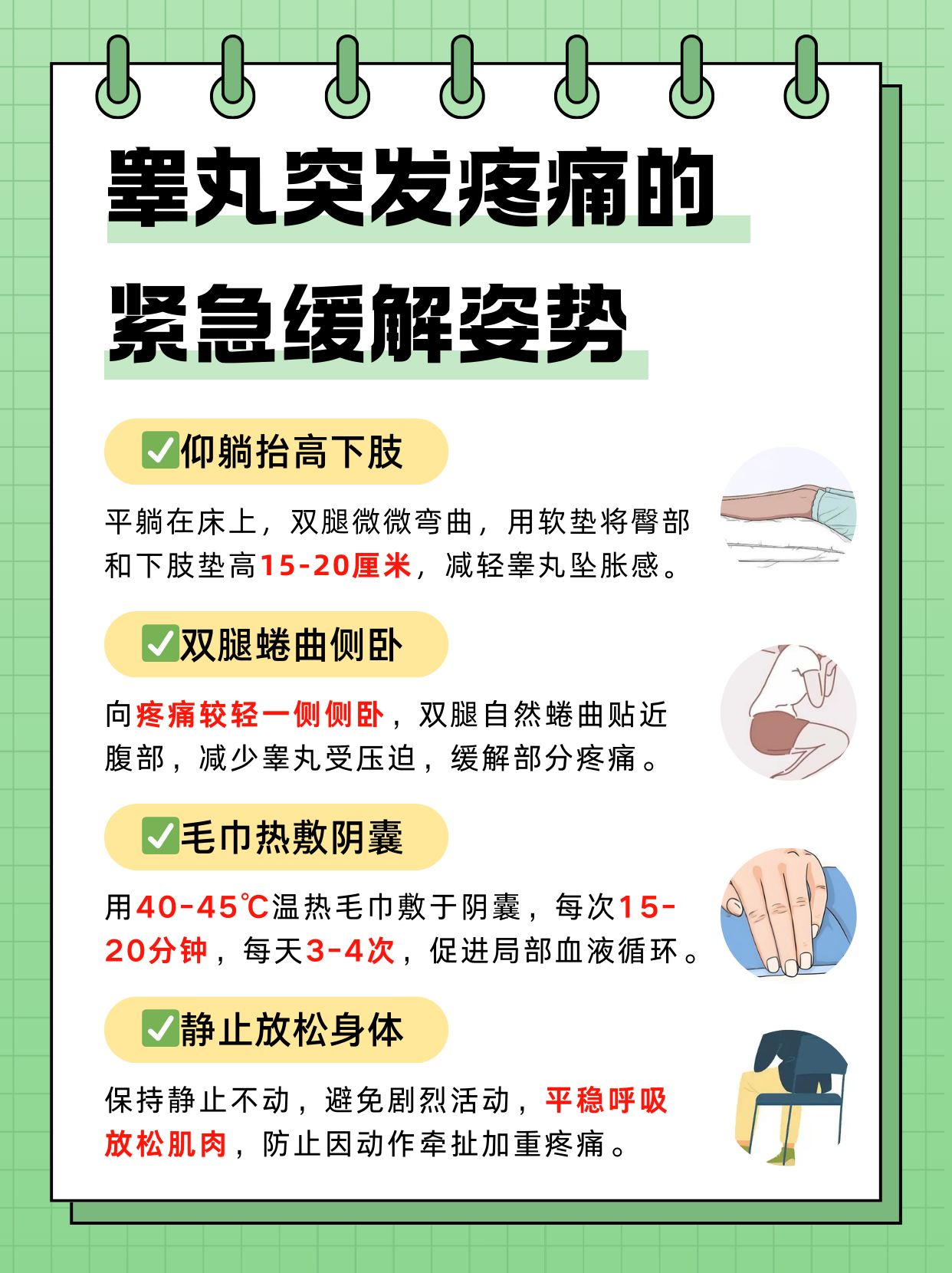 3、左侧睾丸隐隐约约的疼能否自愈,取决于疼痛的具体原因如果是痉挛性疼痛如睾丸炎附睾炎睾丸扭转等情况,存在自愈的可能但这种自愈并非绝对,且可能伴随一定的风险和不确定性如果是病原微生物感染导致的放散痛通常不能自愈,需要积极治疗这包括抗菌消炎治疗或必要的手术治疗,如针对扭转外伤;左边睾丸疼痛的原因有以下几点附睾炎 附睾是睾丸旁边的附属器官,其主要作用是帮助精子通过并存储于输精管内附睾发炎常常导致睾丸部位出现疼痛或不适炎症可能是由细菌或病毒感染引起,通过药物和抗生素治疗可以缓解症状睾丸扭转 睾丸扭转是一种紧急情况,需要立即就医这种情况通常发生在夜间,会导致睾丸;左侧睾丸疼痛的常见原因主要是睾丸炎以下是关于睾丸炎导致左侧睾丸疼痛的详细解释发病群体睾丸炎好发于各个年龄阶段的男性症状表现主要表现为睾丸的胀痛或刺痛,这种疼痛可能持续存在并影响患者的日常生活治疗方法中药治疗主要选择活血化瘀止疼的药物,如西黄胶囊前列欣胶囊等西药治疗主要针对细菌感染引起的睾丸炎,常用药物;左边睾丸疼痛可能的原因有以下几点睾丸炎当睾丸发生炎症时,会出现体积增大和明显的疼痛阴囊内睾丸肿大,阴囊皮肤温度升高或发红活动时疼痛加重,休息时疼痛减轻需要进行抗感染治疗,炎症愈合后疼痛消失精索静脉曲张左侧精索静脉曲张可能导致阴囊坠胀疼痛,波及睾丸引起坠胀疼痛疼痛程度相对轻微,睾丸境界清楚,但周围可摸到增粗的。