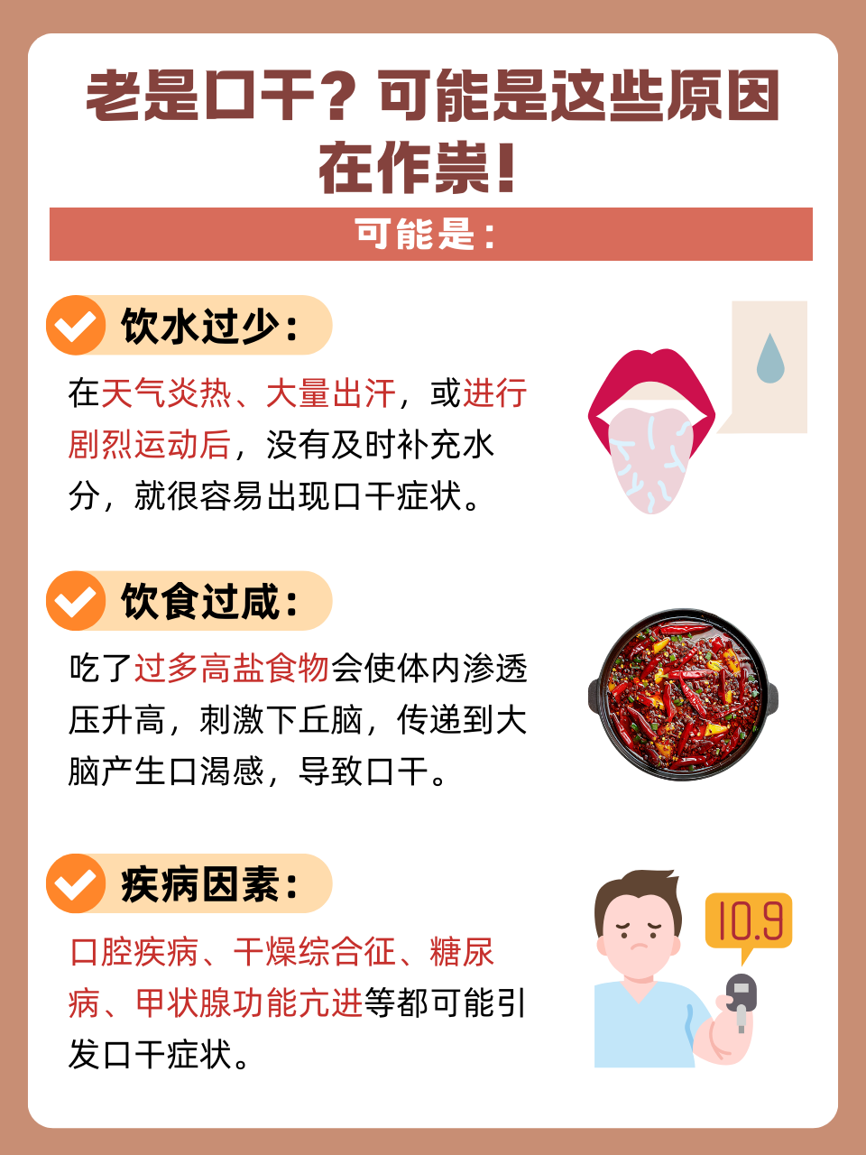 如果总是喝水还觉得口干舌燥,可能的原因分为生理性和病理性因素生理性因素 脱水较严重例如夏天出汗较多时,如果水分补充不够,仍然会觉得口干此时,只有水分补充足够,口干才会好转甚至消失病理性原因 糖尿病由于血糖增高导致血浆渗透压增高,刺激口渴中枢,使患者想不停地喝水同时,血糖增。