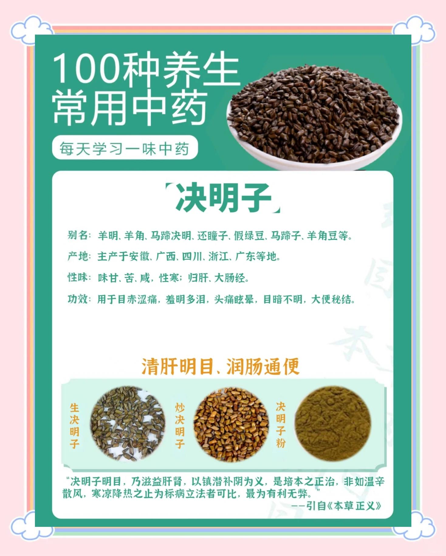9、1决明子功效清热明目通便,适用于肝热或肝经风热所造成的目赤涩痛羞明多泪等症2肝热目赤涩痛,轻者可单独用决明子煎水喝,重者可与夏枯草千里光配合服用风热目赤羞明多泪常常与桑叶菊花白蒺苈一同煎服3决明子可以用于热结便秘,有清热和润肠通便的作用,可单独煎水喝,或者研。