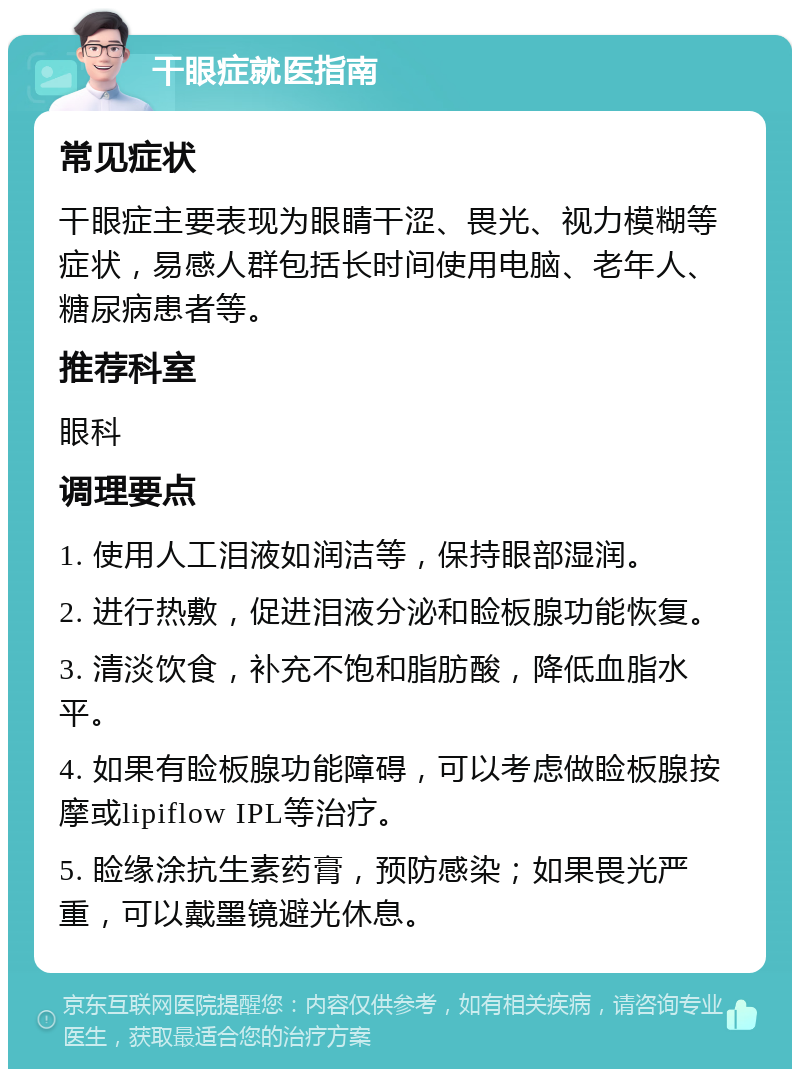 干眼症主要由以下因素导致眼泪的质和量改变任何原因导致眼泪的质和量发生变化,使得泪膜不稳定,都可能引发干眼症炎症或外界环境因素过多使用电子设备如长时间使用手机电脑等,可能导致眼睛疲劳和干涩滥用眼药水不恰当或过度使用眼药水可能对眼睛造成刺激,影响泪液分泌环境因素长期处于风沙干燥的环。