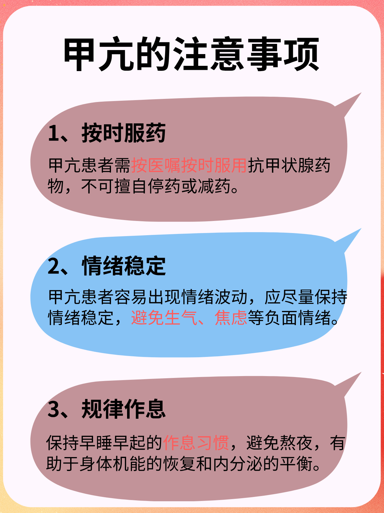 一病因1睡眠不足长期睡眠不足会引发体内应激反应,导致肾上腺皮质激素和儿茶酚胺等激素分泌增加这些激素可刺激甲状腺皮质炎症因子的产生,干扰甲状腺功能的正常调节,进而诱发或加重甲亢2精神压力过大长期精神压力会导致交感神经系统过度激活,释放儿茶酚胺类激素这些激素可能通过直接或间接途径影响。