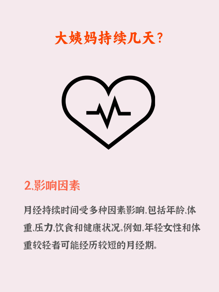 5、每个女人都会来月经,只要是正常女人的话通常是28天来一次,在那几天生理期内,女人会很难受,不能吃冰冷的食物,不能下冷水,而且,在生理期内,女人会情绪不好,容易发脾气作为一称职的男人,你要如何做呢首先是要多做点家务,多体谅自己的女人,比如早起把早餐做好,搞点红糖水给女喝,最;回答你好根据你的描述一般都是5至7天,期间不要冷到,也不要下冷水,不要吃辣和上火的东西不要激烈运动,多休息如果痛经,可以泡些红糖水喝;女生来例假的持续时间一般是28天,平均是35天月经持续时间范围月经周期正常的女性,月经通常会持续2到8天不等平均月经天数大多数女性的月经平均持续时间为3到5天影响因素月经的持续时间可能受到多种因素的影响,包括内在的身体状况和疾病,以及外界的环境天气和压力等建议女性在月经期间注意。