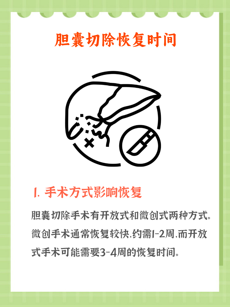 5、微创胆结石手术通常是指腹腔镜下胆囊切除,这种手术通常住院12天即可腹腔镜胆囊切除已经成为胆囊良性疾病的主要治疗方式,包括胆囊结石胆囊息肉,都可以通过腹腔镜进行胆囊切除一般在手术之前需要进行常规的术前检查,部分检查可在门诊来进行,入院当天或第二天就可以安排手术该手术具有创伤小恢复快;术后恢复期间,患者需遵循医嘱,逐步恢复饮食和活动早期以清淡易消化食物为主,避免油腻辛辣食物术后1周内避免剧烈运动,防止伤口裂开或内部出血定期复查如术后1个月复查超声可评估恢复情况,确保无并发症发生总结胆结石手术住院时间通常为5至7天,微创手术患者恢复较快,复杂病情或并发;胆结石手术住院时间一般为37天,但具体时长受多种因素影响手术方式是主要影响因素之一传统开腹手术因切口较大创伤明显,术后恢复较慢,通常需住院710天而腹腔镜微创手术因切口小恢复快,住院时间可缩短至35天患者身体状况也直接影响住院时长若患者年龄较大合并基础疾病如糖尿病。