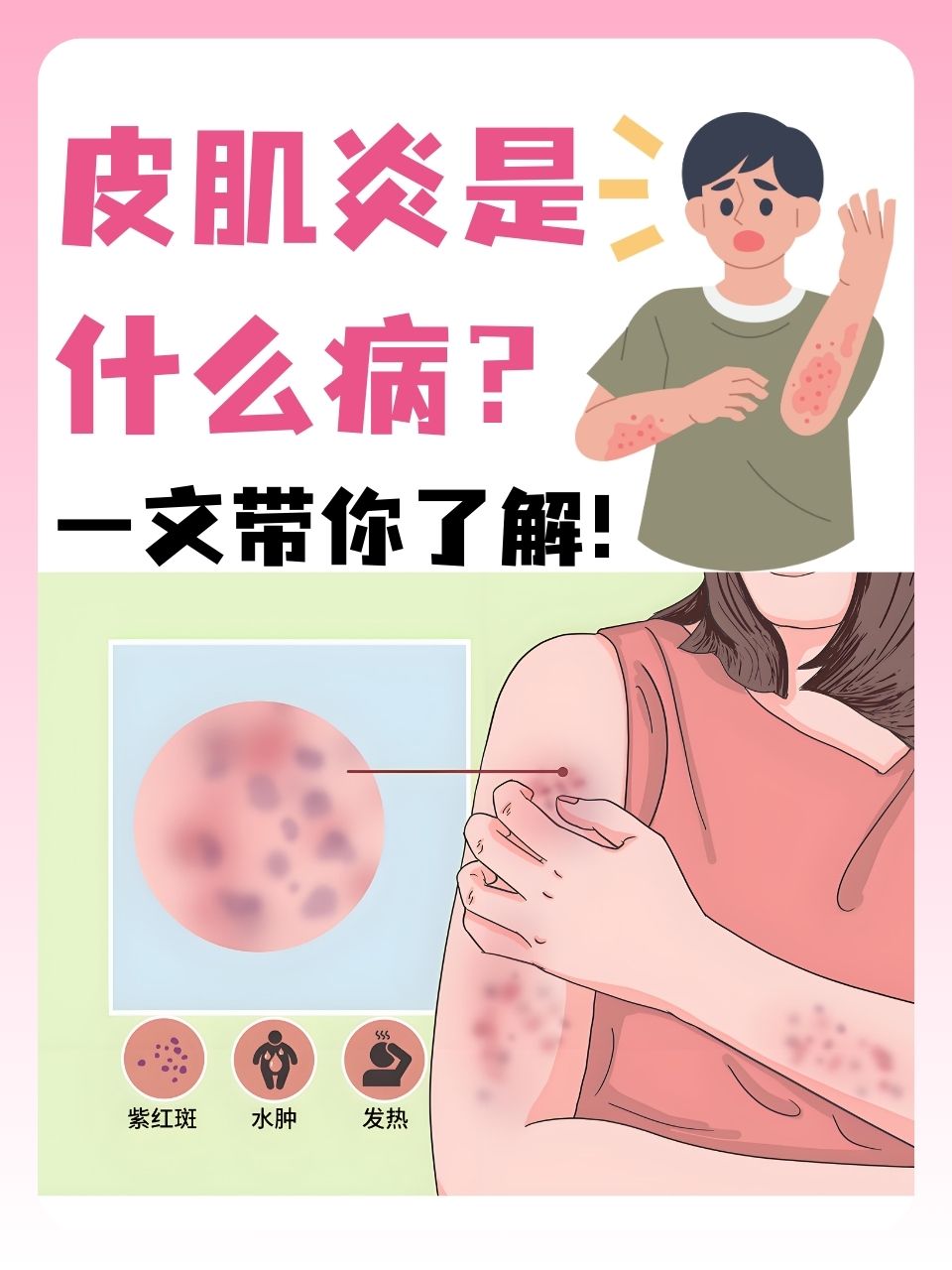 4、约10%合并其他结缔组织病,如JRASLE硬皮病等,少数合并恶性肿瘤死因主要为呼吸衰竭和胃肠道溃疡出血,下面就和小编一起去了解一下西医治疗幼年型皮肌炎的方法与预后一治疗 1一般治疗 注意避免阳光照射,出门宜带帽子和手套,皮肤护理,避免外伤引起溃疡和溃破处继发感染注意心脏功能和呼吸情况;治疗原则对于小儿皮肌炎患者,应去除一切可疑病灶,并遵医嘱采用抗生素合并皮质类固醇治疗,通常效果较为显著;我就是皮肌炎患者,快三年了,吃西药容易复发,就怕感冒会引起复发我在北京吃中药暂时控制住了,感觉挺好的要去正规的医院治疗,以免耽误治疗 已赞过 已踩过lt 你对这个回答的评价是? 评论 收起 华山论剑_神医 20101215 · TA获得超过1081个赞 知道小有建树答主 回答量1400 采纳率0% 帮助的。