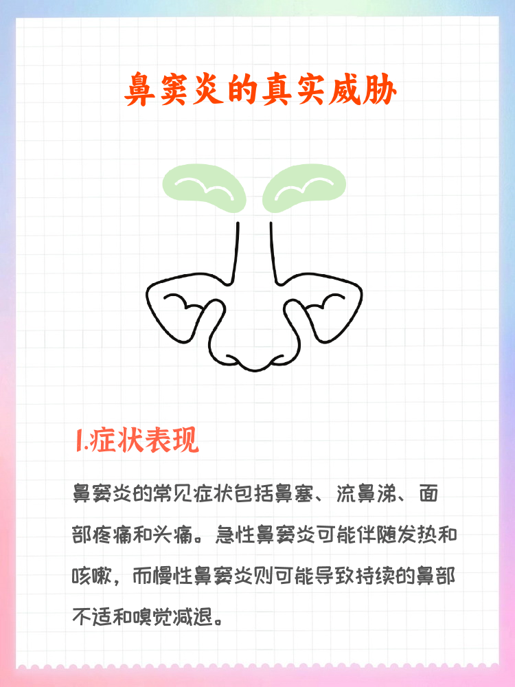鼻窦炎是指鼻窦因感染或其他因素引起的炎症以下是关于鼻窦炎的详细解释1 定义与发病部位 鼻窦炎是鼻窦黏膜的炎症性疾病,主要由细菌感染病毒感染真菌感染等引起2 主要病因 感染性因素细菌病毒或真菌等微生物感染是鼻窦炎最常见的病因 变态反应或免疫因素过敏反应或免疫系统的异常;一病因 感染鼻窦炎主要由细菌真菌或病毒感染引起 易患因素空气污染过敏体质鼻部解剖异常吸烟胃食管反流等疾病都是鼻窦炎的易患因素,也是导致其难以彻底治愈的原因之一二症状 主要症状鼻塞流脓性鼻涕或脓性鼻涕后流咽部 其他症状鼻痒喷嚏头痛或面部痛咽喉痛睡眠;急性化脓性鼻窦炎的病因主要有以下几点免疫力降低疲劳受凉营养不良烟酒过度等因素可导致免疫力降低,从而引发鼻窦炎鼻腔疾病如鼻中隔偏曲鼻腔变态反应病鼻腔肿瘤鼻腔异物以及筛泡过大影响鼻窦引流等,均可导致鼻窦炎的发生扁桃体炎及腺样体肥大这些疾病可导致鼻塞,使鼻窦引流不畅;临床表现流脓鼻涕是鼻窦炎的常见症状,由蝶窦内的感染引起头痛鼻窦炎可能导致头痛,尤其是当感染严重时视力减退或复视蝶窦炎可能影响视神经,导致视力问题诊断影像学检查如CT或MRI,有助于确定鼻窦炎的范围和程度内窥镜检查可以直接观察蝶窦内的病变情况,如粘膜水肿脓痂等治疗;鼻窦炎治不好通常不会影响患者的寿命以下是关于鼻窦炎与生命周期关系的详细解答良性病变鼻窦炎是一种良性病变,它主要影响的是鼻窦黏膜,导致炎症性疾病这种病变并不会直接威胁患者的生命可能病因鼻窦炎的病因多样,包括病毒细菌真菌以及过敏性因素等这些因素虽然会导致鼻窦炎的发生,但并。