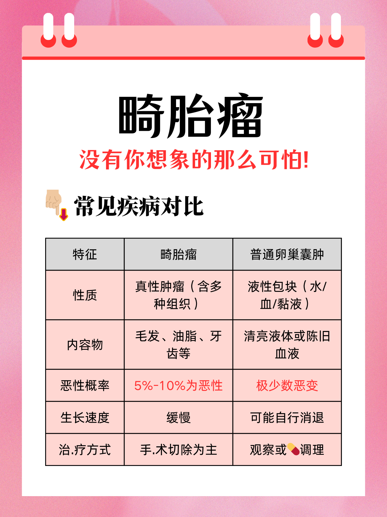畸胎瘤是卵巢的一种良性肿瘤,通常并不严重以下是关于畸胎瘤的详细解答定义与来源畸胎瘤是卵巢生殖细胞异常分化形成的一种卵巢良性肿瘤它多见于年轻女性,肿瘤内常含有毛发等成熟胚胎组织成分,因此得名畸胎瘤B超表现畸胎瘤在B超下具有特异表现,如囊壁厚,囊内有面团样强回声或头发表现治疗方法。