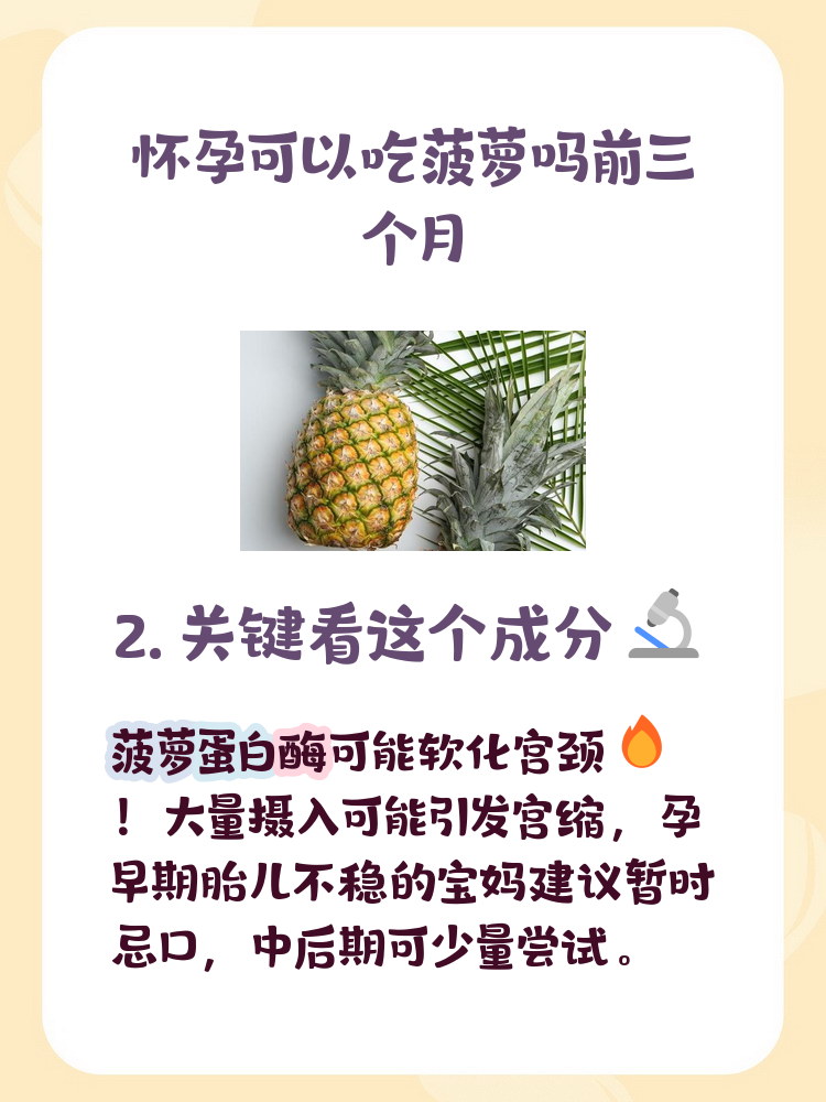 孕妇可以适量吃菠萝,但需注意控制摄入量和个人体质以下是具体分析怀孕早期不宜过量在怀孕早期,孕妇的身体较为敏感,过量食用菠萝可能会对身体造成一定负担,因此建议适量食用体质考虑菠萝属于热带水果,孕妇本身可能体热,过量食用可能加重体内热气此外,菠萝含有蛋白酶,对于过敏体质的人来说;怀孕初期可以适量的吃凤梨凤梨又称为菠萝,它的味甘酸,性微寒,因为酸甜可口对于有早孕反应者可以开胃健脾,尤为适宜凤梨含有分解蛋白,可以用于清理胃肠,分解食物中的蛋白,有助易消化,凤梨含有丰富的维生素和天然微量元素,可以提高孕妇的体质,凤梨可以促进血液循环,降压降脂总而言之,怀孕初期适当吃凤梨是有好处的;怀孕初期,孕妇的身体状况较为敏感且不稳定,因此,在饮食上需要格外小心有些食物因其寒性或具有活血化瘀的功效,孕妇应谨慎食用今天,我们来讨论一个常见的问题怀孕50天的孕妇能否吃菠萝实际上,孕妇可以适量食用菠萝菠萝富含有机酸B族维生素和维生素C等营养成分,具有清热解暑生津止渴开胃;杏仁等这些食物会使人体内热加重,有碍机体聚血养胎综上所述,怀孕前3个月可以适量食用菠萝作为一种营养丰富的水果,菠萝对胎儿的成长发育有益然而,孕妇在享受美食的同时,也需要注意控制食用量,避免过量导致身体不适此外,孕妇在怀孕期间应特别注意饮食禁忌,避免食用对胎儿不利的食物。